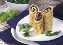 - Започвайки от края, върху който са лентичките Флорентинер, палачинките се навиват стегнато на руло. Краищата на рулата се отстраняват, а останалата част се разделя на две, като всяка половинка - на още две по диагонал. Готовите канапета се подреждат изправени в чиния и се сервират.
